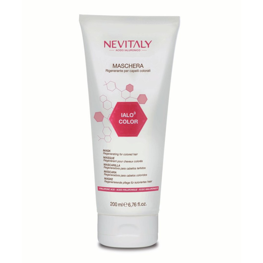 Nevitaly Ialo Color to maska rewitalizująca do włosów farbowanych. Bogata w aktywne składniki intensywnie nawilżające włosy i regenerujące strukturę keratynową. Chroni kolor włosów przed blaknięciem, spowodowanym ekspozycją na promienie słoneczne dzięki filtrom UV. Kolor pozostaje intensywny i pełen blasku przez długi czas. Oleje roślinne nabłyszczają włosy. Kwas hialuronowy wzmacnia strukturę keratynową włosa.