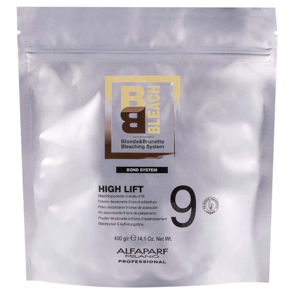 Nowoczesny rozjaśniacz Alfaparf BB Bleach High Lift 9 Tones Pouch. Rozjaśniacz jest wyjątkowo mocny dzięki czemu pozwala na całkowite usunięcie koloru. Włosy można napigmentować po zmyciu mieszanki rozjaśniającej. Preparat pozwala uzyskać jednolity, intensywny, trwały kolor. Można go używać do wszystkich technik "z wolnej ręki". Produkt zawiera technologię Bi-Bond Complex oraz Double Bond Reconstruction, co zapewnia podwójną odbudowę zarówno wewnątrz włosa - chroniąc i odbudowując wiązania keratynowe - jak i na zewnątrz Lekka konsystencja łatwo miesza się z oksydantem i rozprowadza na włosach. Formuła wzbogacona została w substancje odżywcze, które pozytywnie wpływają na kondycję włosa, dzięki czemu po zabiegu włosy wyglądają zdrowiej.