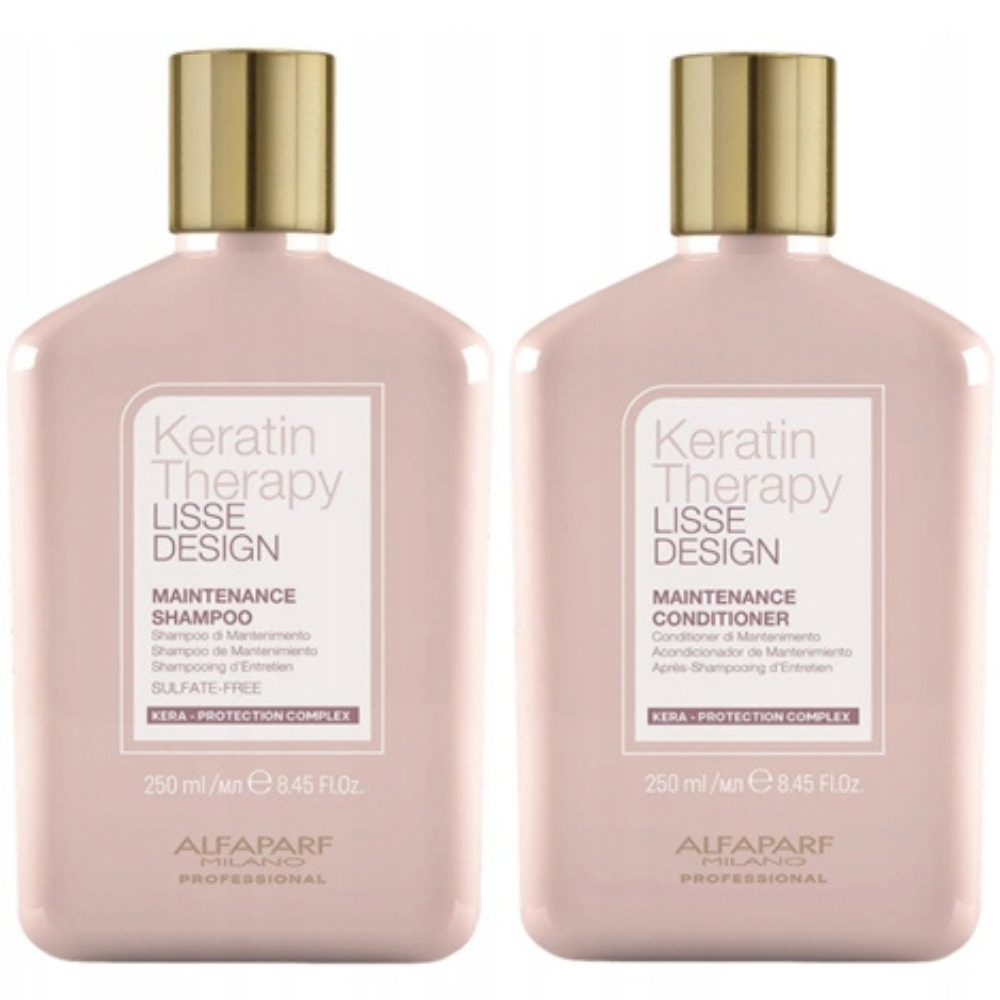 Alfaparf Keratin Therapy Lisse Design to zestaw do włosów po keratynowym prostowaniu, króry ułatwia rozczesywanie i rewelacyjnie odżywia. Przedłuża efekt po zabiegu keratynowego prostowania, aby dłużej cieszyć się efektami zabiegu przeprowadzonego w salonie. Kosmetyki sprawią, że włosy łatwo się rozczesują i są jedwabiście lśniące. Skład został wzbogacony w keratynę i olejek Babassu, dzięki czemu włosy będą miękkie oraz błyszczące. Formuła wzbogacona została w keratynę, która wbudowuje się w pasma włosów. Formuła zawiera kompleks Kera-protection, będący połączeniem keratyny i kolagenu roślinnego, który chroni włosy i nadaje im miękkość i jedwabistość.