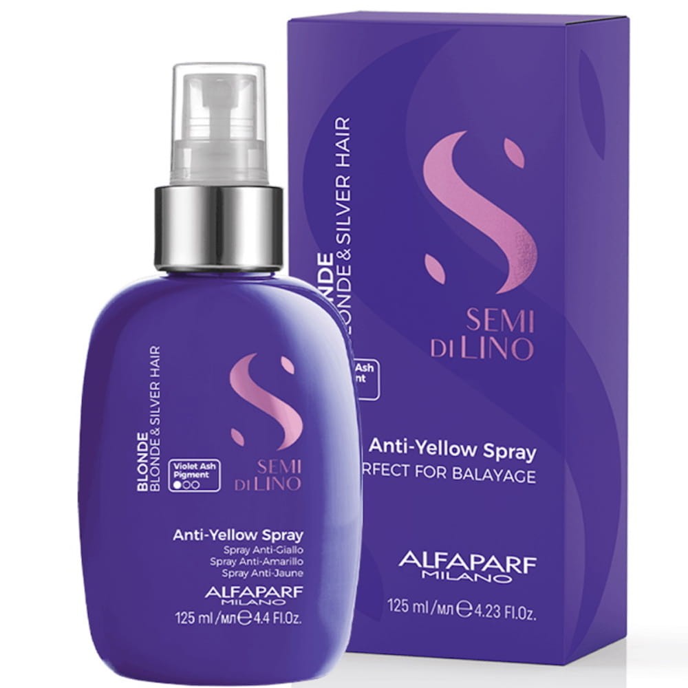 Spray do włosów Alfaparf Semi Di Lino Blonde Anti-Yellow przeznaczony do włosów blond i siwych, naturalnych i rozjaśnianych. Idealnie nadaje się również do włosów z balayage. Formuła wzbogacona w aktywne składniki Shine Fix Complex oraz Color Fix Complex - połączenie filtrów UV i antyoksydantów, które przedłużają piękny wygląd koloru oraz zapewniają połysk przez 24h od nasady aż po same końce. Kosmetyk bogaty jest w Violet Ash .21, czyli pigment fioletowoniebieski, który niweluje żółte refleksy. Struktura makromolekularna sprayu chroni włókna włosów przed zanieczyszczeniami i metalami ciężkimi dzięki tworzeniu warstwy ochronnej. Spray zawiera kompleks stopniowo uwalniający substancję czynną, zapewniającą wyjątkowo długotrwały połysk.