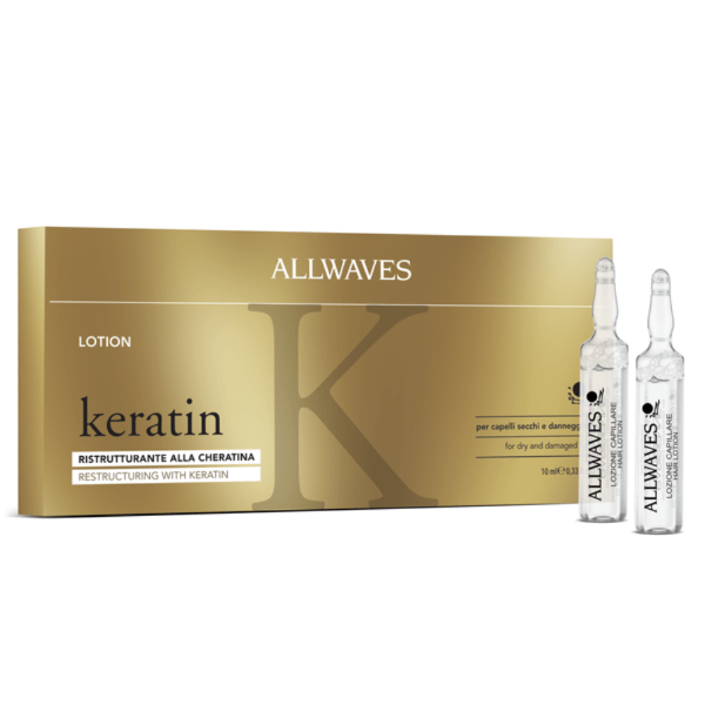 Kuracja zapobiegająca procesom starzenia się Allwaves Keratin. Ampułki przeciwdziałają procesom starzenia. Balsam zawiera wysokie stężenie Hydrolizowanej Keratyny, która wnika w strukturę zniszczonych włosów, odbudowując je od wewnątrz: niezbędne białko znajdujące się w tkance ciała, Keratyna wzmacnia zniszczone zabiegami włosy, naprawiając je i uszczelniając naskórek. Przy regularnym stosowaniu balsam restrukturyzuje , uzupełnia regenerujące właściwości włókna i zapewnia głęboką ochronę. Włosy nabierają witalności, stają się zdrowsze i bardziej błyszczące.