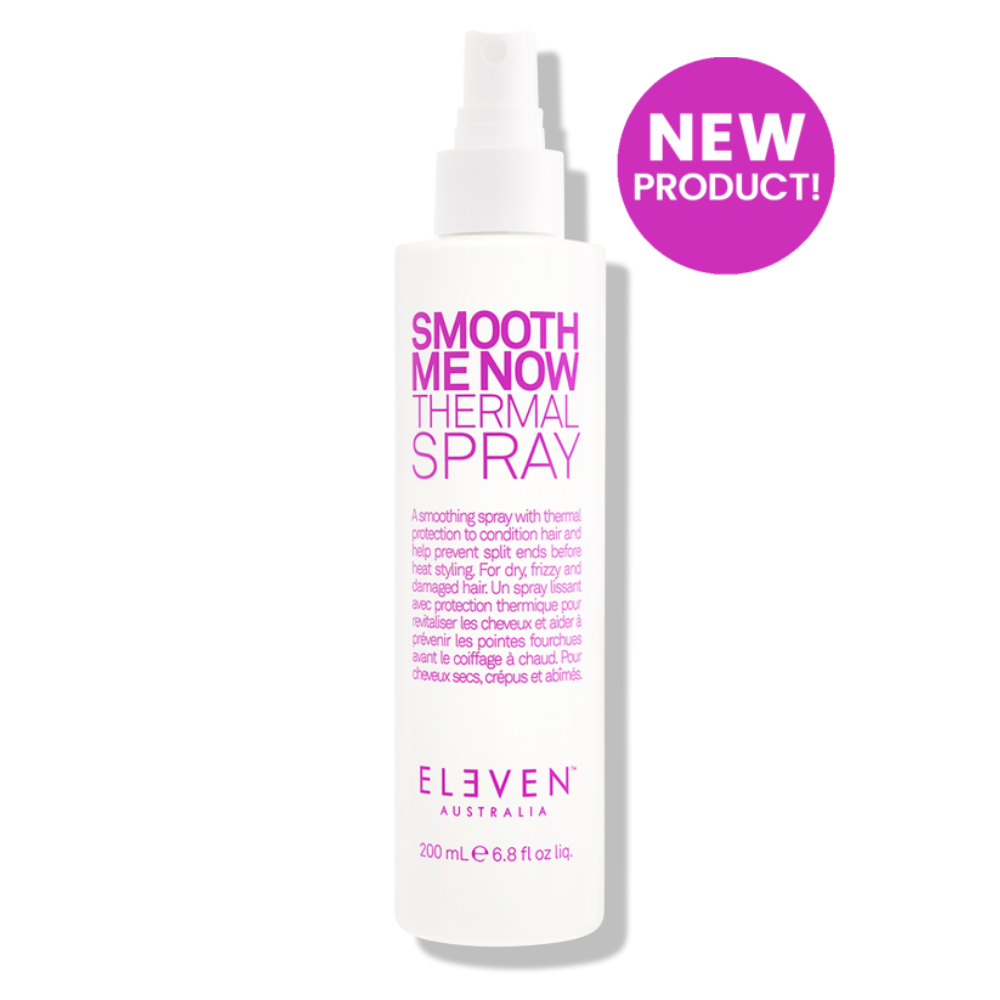 Eleven Australia Smooth Me Now Thermal Spray to niezbędna nowość od marki Eleven Australia. Ten termoochronny spray wygładzający włosy nie tylko zabezpieczy Twoje kosmyki przed wysoką temperaturą, ale również ułatwi ich prostowanie i stylizację! Dodatkowo produkt jest bezpieczny dla włosów farbowanych.