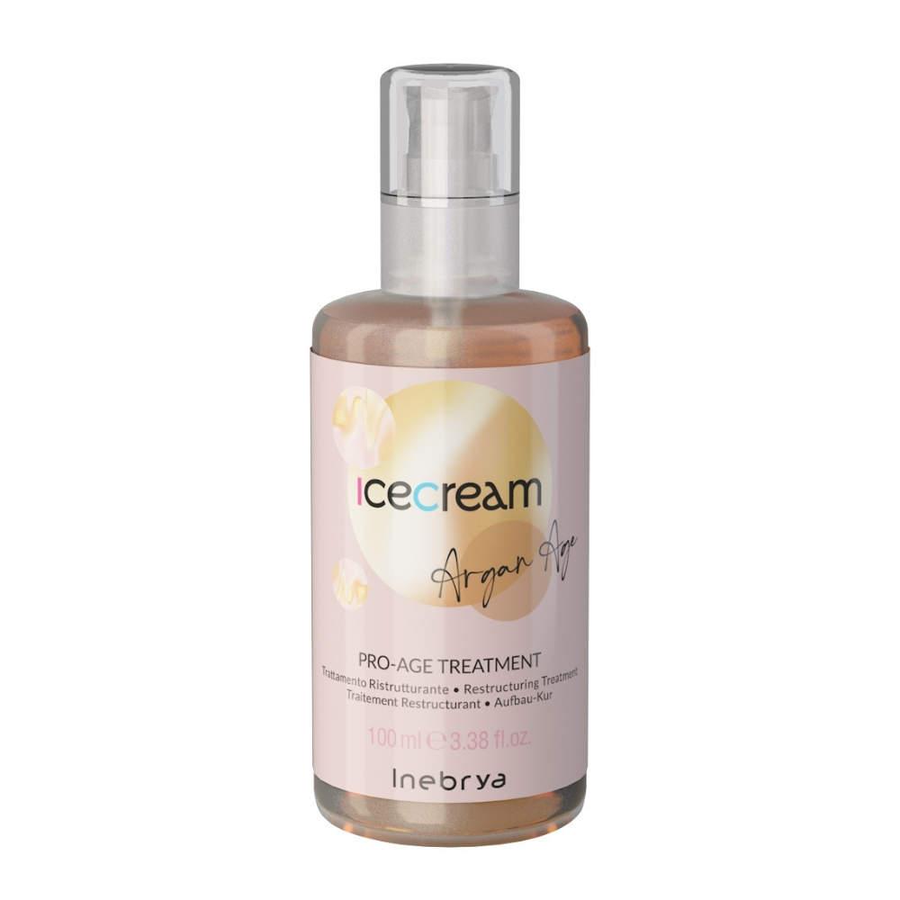 Fluid Inebrya Argan Age Pro Age Treatment z dodatkiem olejku arganowego świetnie regeneruje włosy, a dodatkowo odżywia i nawilża. Zawartość olejku jojoba oraz oleju słonecznikowego przywraca włosom siłę, blask i witalność. Przeciwidziała elektryzowaniu się i rozdwajaniu końcówek. Wzbogacony został w filtr UV który chroni przed szkodliwym działaniem promieni słonecznych oraz wysokiej temperatury. Produkt zabezpiecza łuski włosa przed rozdwajaniem. Dla uzyskania lepszego efektu najlepiej używać w zestawie z szamponem i maską Inebrya Ice Cream Argan Age.