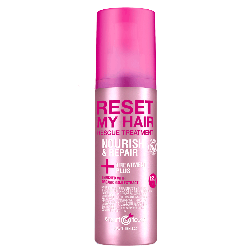 Bardzo skuteczna, uniwersalna kuracja Montibello Reset My Hair Rescue Treatment+, która odżywia i odbudowuje włosy, niwelując uszkodzenia wynikające z działania szkodliwych czynników środowiskowych, zanieczyszczeń, stosowania agresywnych produktów kosmetycznych i innych czynników przyczyniających się do utraty zdrowia i witalności. Chroni włosy przed zanieczyszczeniami i agresywnymi czynnikami zewnętrznymi, zapobiegając przyleganiu szkodliwych cząstek do włókna włosa. Kompleks białek roślinnych chroni przed blaknięciem koloru i skutkami działania wysokiej temperatury oraz odmładza.