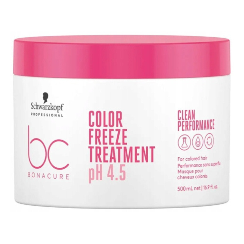 Schwarzkopf Bonacure Color Freeze to maska przeznaczona do włosów farbowanych, rozjaśnianych i poddawanym zabiegom chemicznym. Ponadto maska ma właściwości odżywcze, zmniejsza puszenie się i wygładza włosy. W 100% wegański skład, został wzbogacony w wegańska, hydrolizowaną keratynę która wbudowuje się w otwarte łuski włosa. Maska ma kwaśne pH 4.5, dzięki zawartości kwasu mlekowego i wodorotlenku wapnia napina i stabilizuje macierz włosa, zatrzymując kolor na dłużej i chroniąc przed jego blaknięciem. Hamuje wypłukiwanie się koloru, dzięki czemu przedłuża trwałość farbowania. Kremowa konsystencja z technologią Cell Equalizer, odnawia zewnętrzną warstwę włosów, nadaje im blask i zdrowy wygląd.